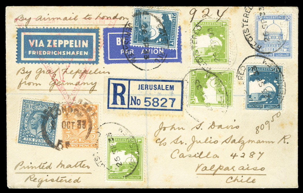 | 1933 Chicago flight cover (9th SAF to Chicago and South America, 50th Crossing of the Atlantic), registered from Jerusalem to Valparaiso, Palestine dispatch via London to Berlin, with connecting cachet applied on back, used in combination with British franking applied in London, Valparaiso, Chile 22 October arrival postmark on back, faint toning, fine and rare cover, one of only 10 flown |