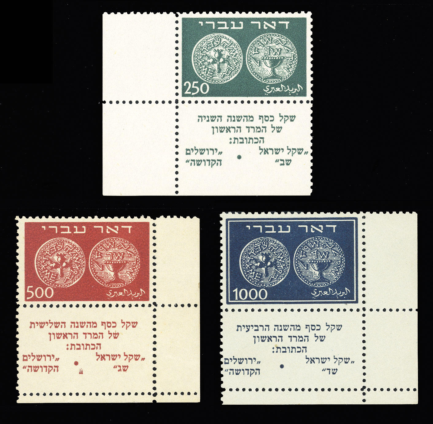 | 1948 Doar Ivri, 250m-1000m with tabs, set of sheet margin singles, never hinged and post office fresh, faint fingerprint impressions on gum as often, still v.f. |