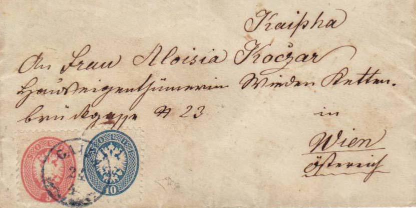 | CAIFA (Haifa), gray blue single circle postmark with ornament with 5 & 10 Soldi coat of arms to Vienna, approximate 1866, on reverse a transit postmark from Trieste as well arrival postmark from Vienna. |
