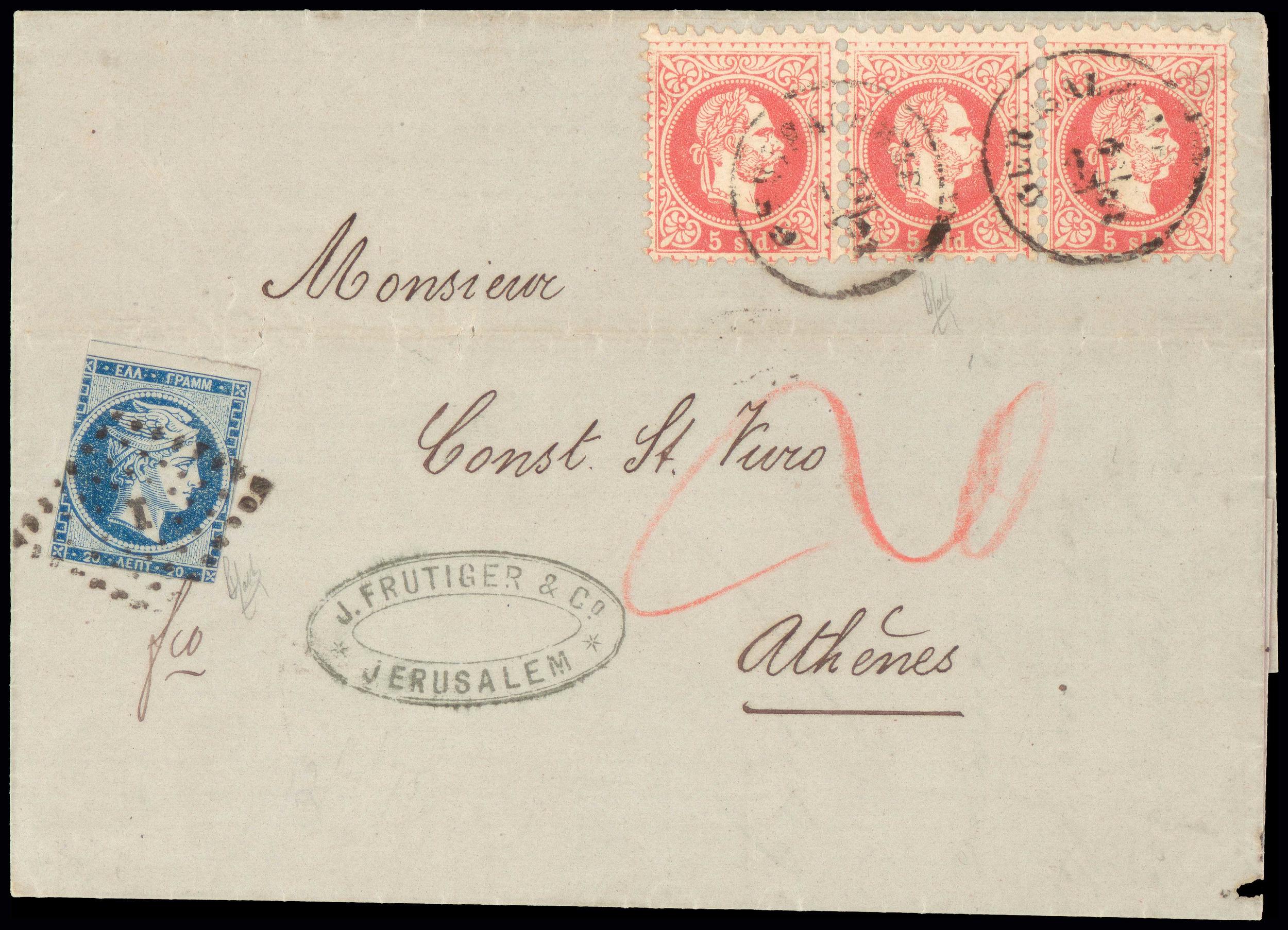 | Jerusalem (GERUSALEMME) 12.2.1875 paid with 15Sld, via Lloyd Agenzie Smirne to Athens. |